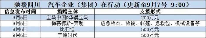截至9月7日9时,已有4家汽车、零部件企业(集团)加入到了驰援四川的工作中,累计捐赠现金1200万元,并捐赠应急棉衣、棉被、帐篷、急救包、机械设备等物资。