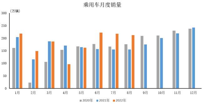 2022年8月,乘用车产销分别完成215.7万辆和212.5万辆,环比分别下降2.4%和2.3%,同比分别增长43.7%和36.5%。