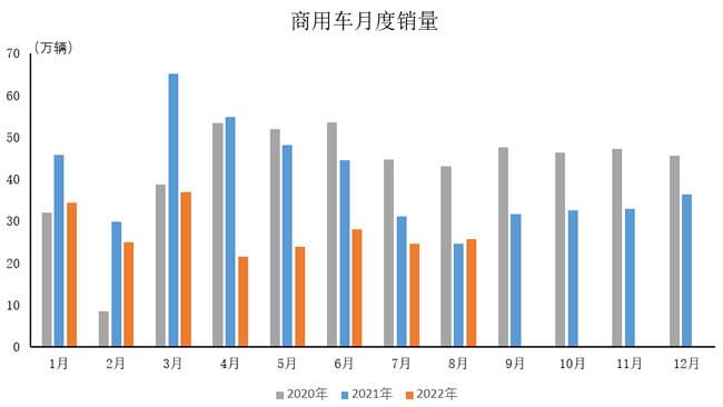 2022年1-8月,商用车产销分别完成216.5万辆和220.6万辆,同比分别下降34.1%和36.2%。