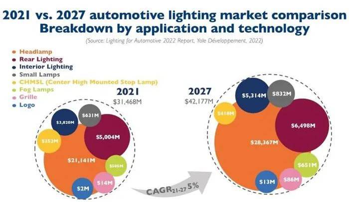 法国咨询公司Yole Group预测,从2021年到2027年,汽车照明市场将以每年5%的速度增长,与此同时汽车产量每年只会增长2%,汽车照明行业的发展预计将超越汽车产量的增速。从市场规模来看,分析师Boulay预计,到2027年,汽车照明市场的规模将从2021年的315亿美元增加到422亿美元。Boulay还透露,LED前大灯正从高端和豪华车逐渐普及到主流汽车,这将有助于保持汽车照明市场的增长速度。