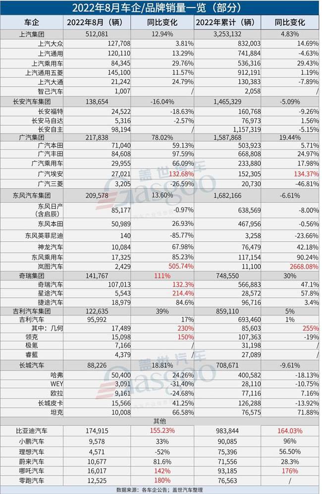 近日,各大车企陆续公布8月销量成绩。从盖世汽车汇总的数据来看,该月有个别车企受限电等因素影响而销量下滑,但多数车企表现依旧在线,比亚迪、哪吒、零跑等甚至翻番增长。