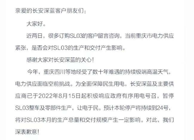 其实,早在8月18日,长安就在相关公告中提到,为全面保障民生用电,长安深蓝及主要供应商已于8月15日暂停SL03整车及零部件生产,这将对SL03本月的生产总量和交付规模产生一定影响。而对于长安来说,受到影响的显然并非这一款车型。