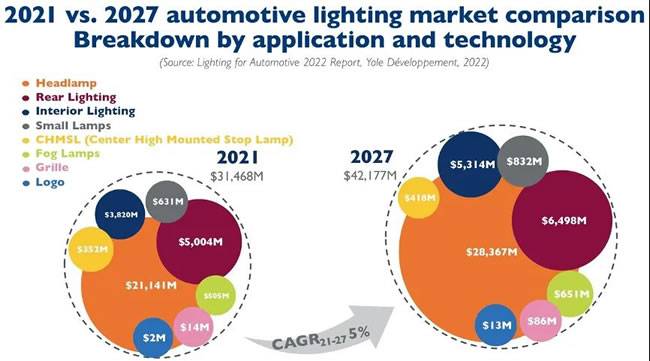 2021年中国车用照明灯具市场容量(图源:前瞻产业研究院)汽车车灯增长迅速LOVE CAR DAY据Yole数据显示,2021年汽车照明市场规模是314.68亿美元,其中前照灯(头灯)占比约67.18%达到211.41亿美元。2021~2027年的年均复合增长率CAGR是5%,2027年达到了421.77亿美元,可以从数据看出增长速度肉眼可见,仍有巨大的蓝海市场。
