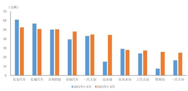 据中国汽车工业协会统计分析,2022年1-8月,销量排名前十位的SUV生产企业共销售395.2万辆,占SUV销售总量的57%。