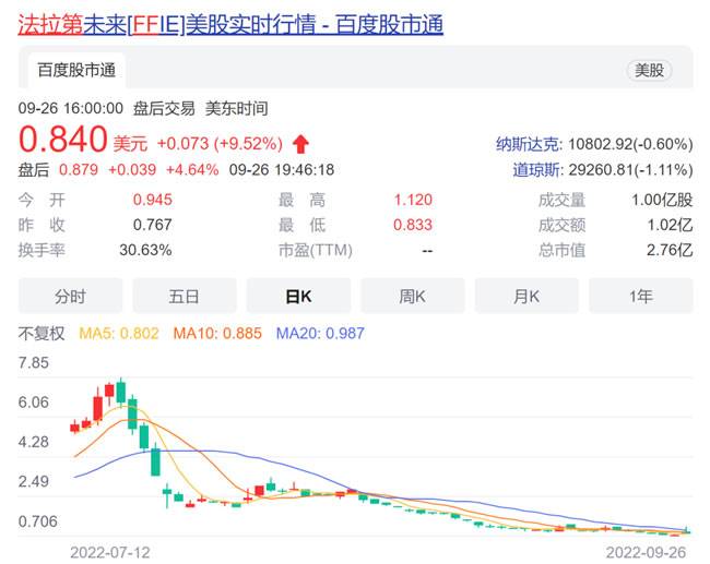 与之同时,FF还为投资者带来了一个好消息,最新顺利融资超1亿美金,为“造车梦”注入新的源泉。或受此消息刺激,9月26日早盘,FF股价迅速拉升,涨幅一度逼近47%;之后有所回落,截至收盘,该股上涨约9.52%。