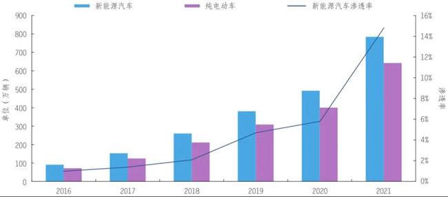 新能源汽车在全球得到各个国家的认可与推崇,大的经济体中心也将随着新能源汽车的蒸蒸日上而,几乎所有传统汽车巨头都开始电动化转型,加紧推出电动汽车车型。销售量来看,我国新能源汽车的销售量从2010 年不足 1万辆增长到2021年的3.3百万辆。按2021年销量计,中国拥有全球最大的新能源汽车市场,大致约为整个欧洲市场规模的两倍,约为美国市场规模的五倍。同时,新能源汽车在中国乘用车市场的渗透率从2017年的2.4%快速增长至2021年的16.0%,新能源汽车在主流的大众消费群体中越来越受欢迎。