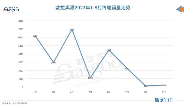 先说欧拉黑猫,今年2月,在原材料价格大幅上涨的背景下,为了避免亏损扩大,欧拉宣布暂停接收黑猫和白猫的订单,暂停持续时间未知。从数据上看,欧拉黑猫自2月底停止接单后,3月终端销量达到全年最高点,而之后的几个月终端销量便走了下坡路,8月,欧拉黑猫的销量仅有254辆。