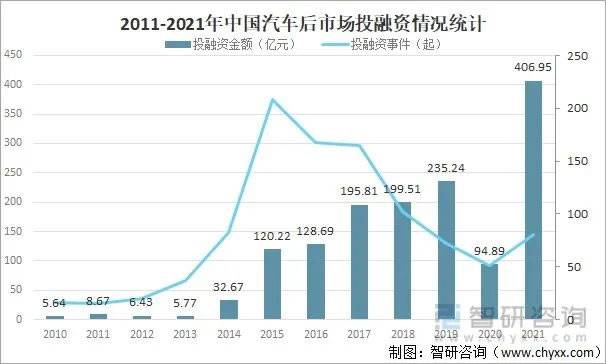 2021年,中国汽车后市场发生80起投融资事件,投融资金额完成406.95亿元,创近十年来最高水平,其中主流投资标的也是连锁品牌。