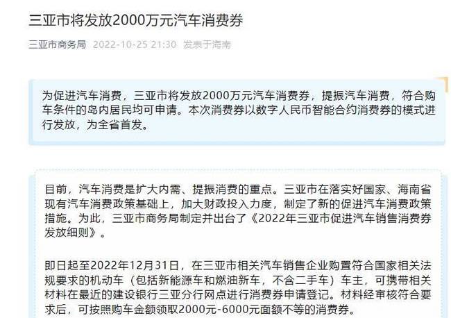 为促进汽车消费,三亚市商务局表示,将发放2000万汽车消费券,提振汽车消费,符合购车条件的岛内居民均可申请。本次消费券以数字人民币智能合约消费券的模式进行发放。