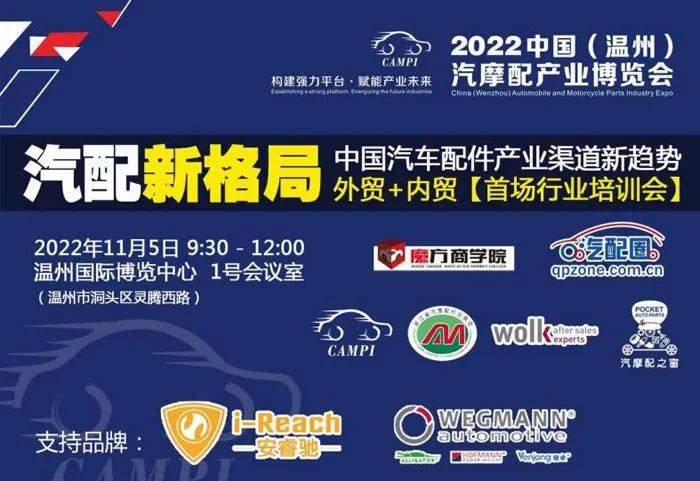 由魔方商学院主办的“汽配新格局,中国汽车配件产业渠道新趋势,(外贸+内贸)首场行业培训会”将于2022年11月5日在温州国际博览中心举办,培训会围绕渠道变革内容展开,从外贸角度,分析在疫情大环境下的全新格局、海外市场情况,以及国内汽配从业者该如何做变革和适用,如何降低成本,做好渠道渗透。从内销方面,讨论在中国汽配行业的快速升级转型中渠道+终端的变化情况,供应链服务效率的需求核心在哪里,企业(厂商&经销商)该如何去针对国内渠道的升级做改变。