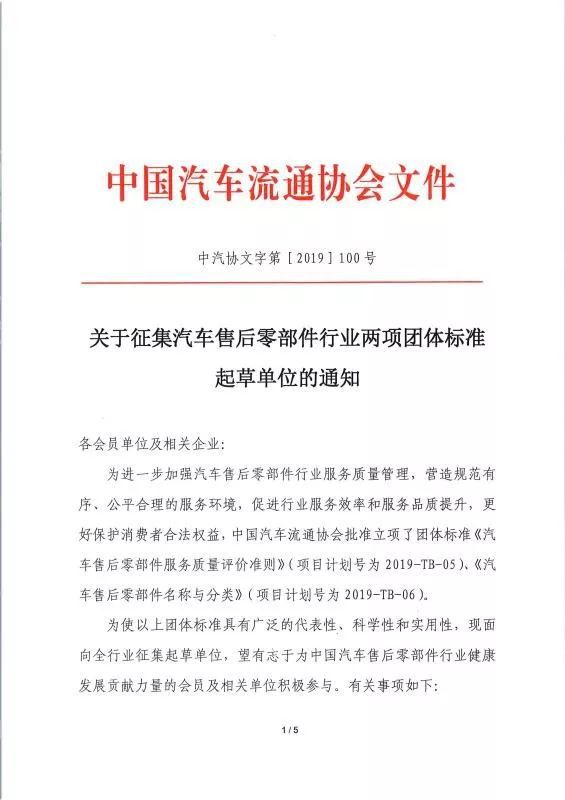 为进一步加强汽车售后零部件行业服务质量管理,营造规范有序、公平合理的服务环境,促进行业服务效率和服务品质提升,更好保护消费者合法权益,中国汽车流通协会批准立项了团体标准《汽车售后零部件服务质量评价准则》(项目计划号为2019-TB-05)、《汽车售后零部件名称与分类》(项目计划号为2019-TB-06)。