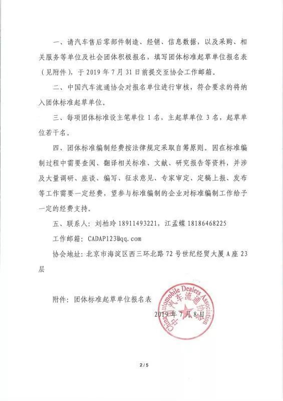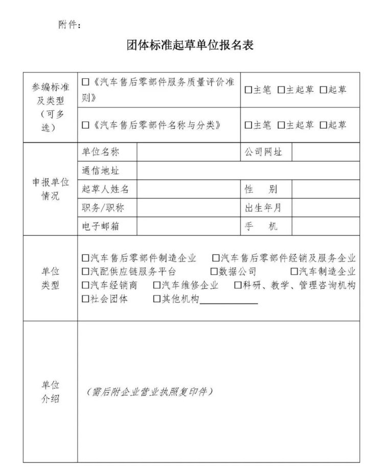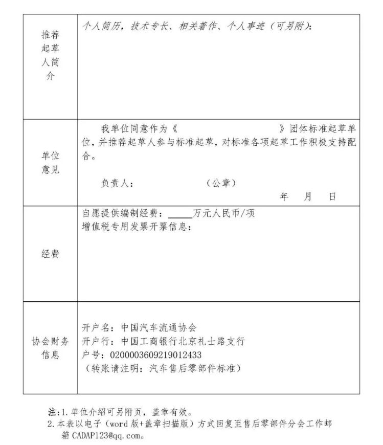 1、填写《团体标准起草单位报名表》(见附件一,加盖单位公章),扫描报送至中国汽车流通协会售后零部件分会工作邮箱cadap123@qq.com.。