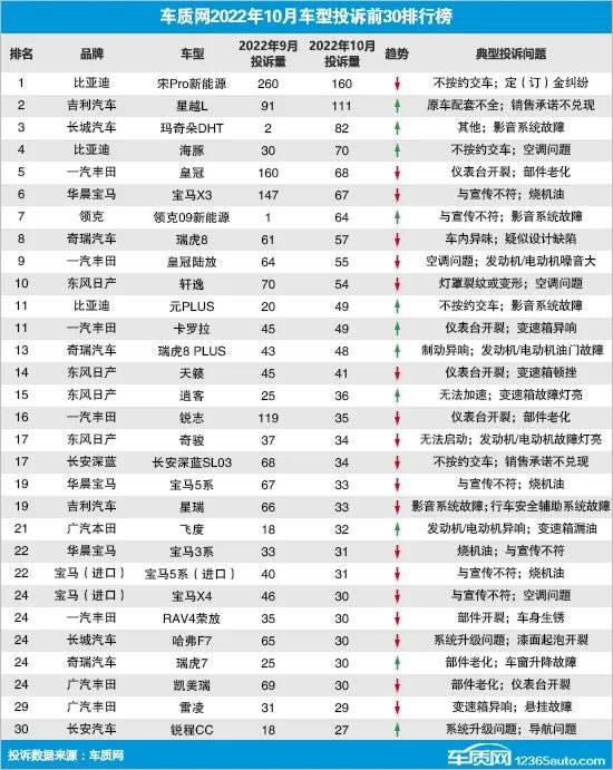 综合投诉榜单整体情况来看,10月国内汽车投诉量环比有所下滑,但仍保持过万宗的体量,自主品牌和合资品牌投诉数据基本相差无几,投诉问题多为" 不按约交车 " 、 " 与宣传不符 "、 " 仪表台开裂 " 和 " 部件老化 " 问题,其中" 仪表台开裂 " 和 " 部件老化 " 问题多集中在日系品牌车型中;而比亚迪则因为订单火爆导致供不应求局面,也因此多车主投诉比亚迪“提不到车”,交车时间慢。