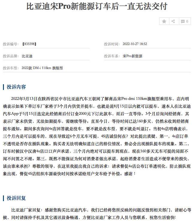 从榜单上来看,比亚迪宋Pro新能源因“不按约交车和定金纠纷”问题被投诉至榜首位置,换言之,比亚迪宋Pro新能源并非因车辆本身质量问题被投诉。据统计,10月该车总投诉量为160起,环比9月260起有所下滑。有车主投诉,5月13日在陕西省汉中市下单宋Pro dmi 110km旗舰型乘用车,原计划8月15日以内提车,但等待了近6个月依然被告知无车可提。