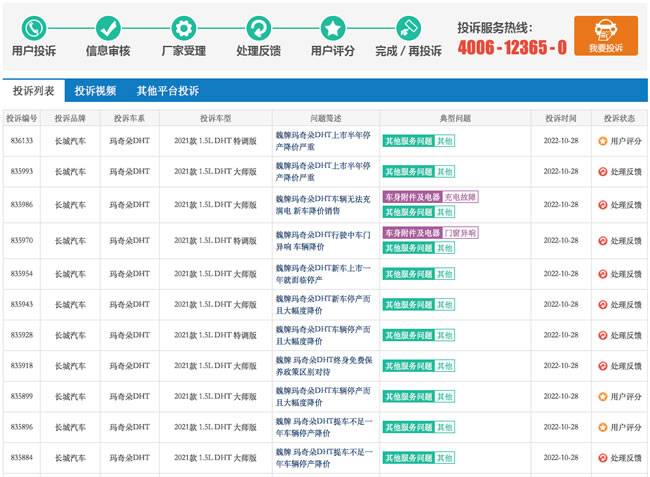 长城汽车魏牌玛奇朵DHT车型9月仅2起投诉,10月直接增至82起,投诉原因为“影音系统故障”,此外,汽车行业关注还注意到10月车质网有多起魏牌玛奇朵DHT上市半年停产降价严重的投诉,涉及车型为2021款1.5LDHT特调版/大师版。有车主投诉称,该车上市半年就停产,销售商大幅度降价,仪表台中控屏黑屏死机,车身异响,A柱饰板开裂。同样存在“影音系统故障”的还有领克09新能源车,投诉量也出现明显增多。