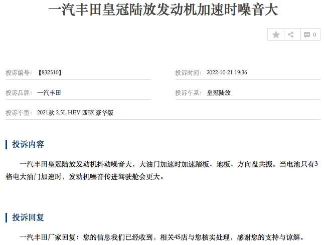 一汽丰田皇冠以68起位居投诉榜第五名,主要投诉问题是中控仪表台老化出油开裂,不过9月投诉量为160起,10月有明显下滑至68起,说明该问题有所好转。一汽丰田旗下皇冠陆放则因为“空调问题;发动机/电动机噪音大被投诉至第九名。多名车主表示:“一汽丰田皇冠陆放发动机抖动噪音大,大油门加速时加速踏板、地板、方向盘共振。当电池只有3格电大油门加速时,发动机噪音传进驾驶舱会更大”。