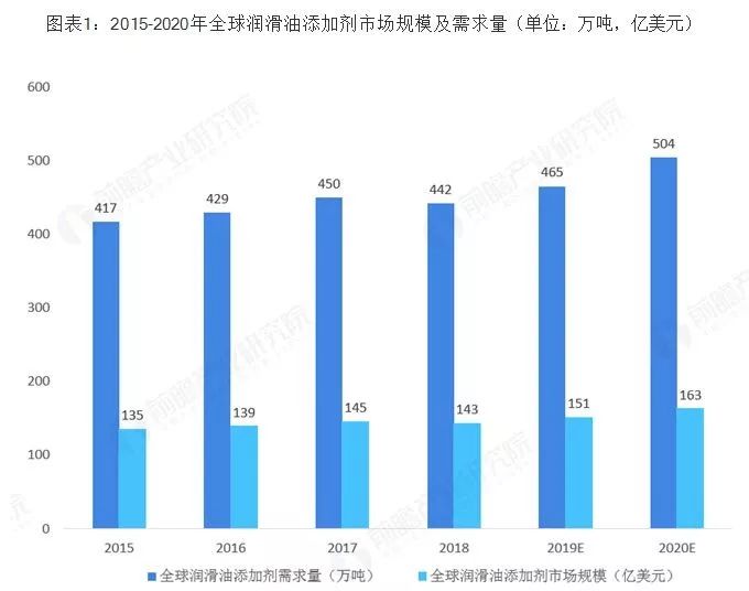 添加剂是润滑油产业链中重要的组成部分,加入到润滑油中,可以赋予润滑油各种功能特性。在全球市场中,润滑油添加剂全球市场消费量保持稳定,亚太地区消耗量的预期增速快于其他地区。在此期间欧洲、北美添加剂市场出现下降,主要由于2008年至2010年全球经济衰退和2011年欧洲主权债务危机导致,不过中国、印度为代表的亚太新兴国家在该期间的消费量快速增长保证了全球供需的稳定。2018年,全球润滑油添加剂市场消费量约为442万吨,市场规模达到143亿美元。