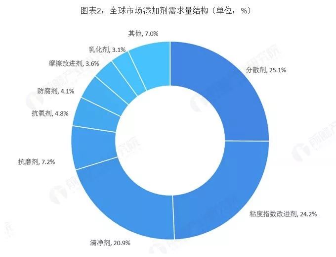 由于目前全球润滑油行业需求大部分为车用润滑油,而车用润滑油的发动机油需要种类更多,质量更高的润滑油,需要在基础油中添加清净剂、分散剂和粘度指数改进剂来提高润滑油的各项指标,因此,分散剂、粘度指数改进剂和清净剂需求最大。在各类润滑油添加剂中,分散剂、粘度指数改进剂、清净剂3大功能剂占添加剂总消耗量的71%,其中分散剂占比最大,约占全球添加剂需求量的25.1%;其次为粘度指数改进剂,约占全球添加剂需求量的24.2%;清净剂约占全球添加剂需求量的20.9%。
