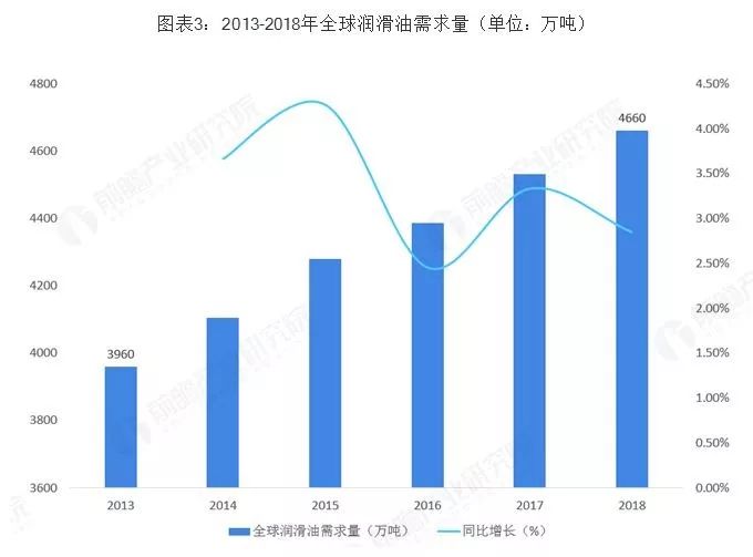 随着全球汽车工业不断发展,汽车保有量不断上升,对润滑油的需求也持续增大,全球润滑油供给和需求量虽有所震荡,但是基本保持稳定增长。根据中国润滑油网数据显示,2013-2018年,全球润滑油消耗量由3960万吨增长至4660万吨,年均增长率到达3.53%。