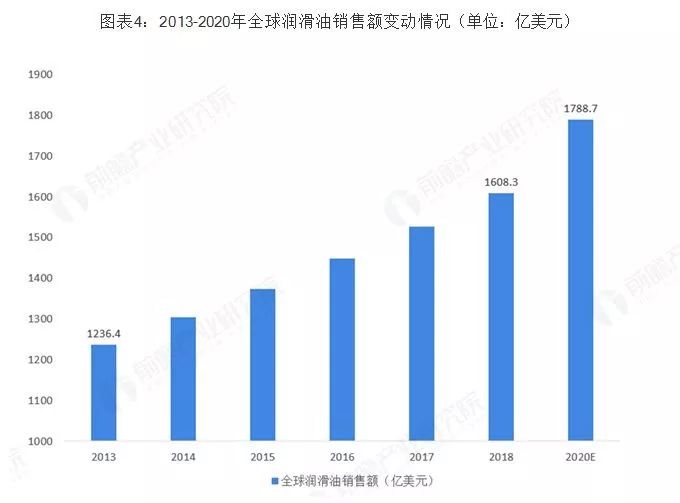 根据弗若斯特沙利文以及中国润滑油网统计数据显示,随着全球润滑油消耗量逐渐增长,全球润滑油行业销售收入也同样呈上升趋势,润滑油价格基本随原油价格同比波动,波动时间滞后原油价格2-3个月。2018年,全球润滑油销售金额约为1608.3亿美元,年均复合增长率超过5%,预计2020年,全球润滑油销售额将会达到1788.7亿美元。