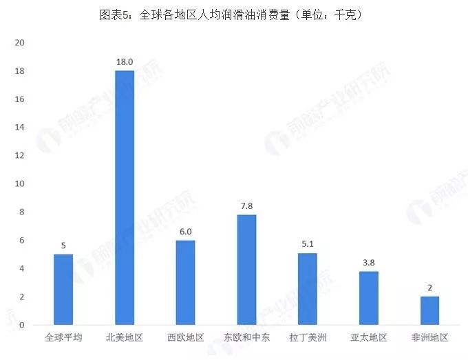 全球平均润滑油消耗约5千克,但地区差异非常显著。北美人均消费量超过18千克。而亚太地区人均消费不足4千克,非洲仅仅2千克。西欧人均消耗约9千克,东欧和中东人均消耗接近8千克,拉丁美洲人均消费量也刚刚超过5千克。作为全球经济增长的引擎,亚太地区润滑油行业将持续保持快速增长状态,亚太地区人均消耗量较发达地区差距较大,市场增长空间十分乐观。