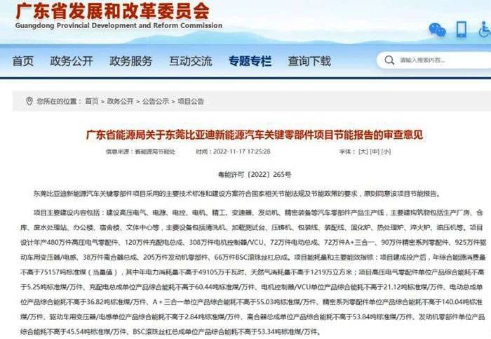近日,广东省发展和改革委员会发布消息,东莞比亚迪新能源汽车关键零部件项目节能报告通过了广东省能源局的审查。至此,该项目正式落地。公告显示,该项目由比亚迪股份有限公司(简称“比亚迪”)全资控股子公司——东莞弗迪动力有限公司实施建设,建设地位于东莞市谢岗大厚村,总投资额高达65亿元,总建筑面积约95万平方米。