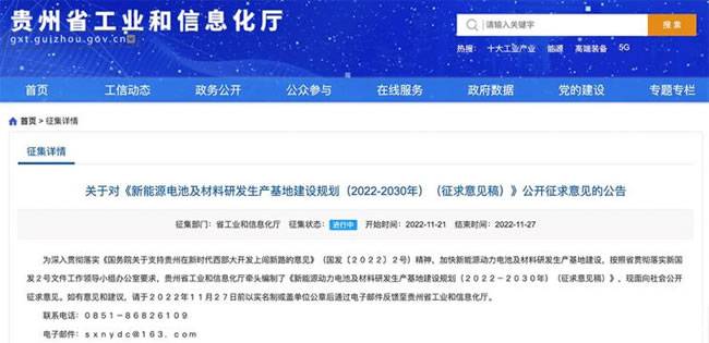 近日,贵州省工信厅网站发布《新能源电池及材料研发生产基地建设规划(2022-2030年)(征求意见稿)》。征求意见稿提出,到2025年,新能源电池及材料产业取得明显进展,全省新能源电池及材料产业规模实现倍增,力争突破5000亿元,成为全省经济又一重要增长极。