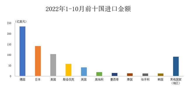 2022年1-10月,上述十国汽车商品累计进口金额750.7亿美元,占全部汽车商品进口总额的87.7%。