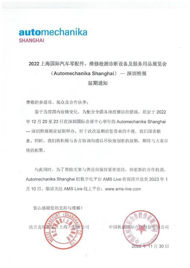 11月30日,上海国际汽车零配件、维修检测诊断设备及服务用品展览会组委会发布深圳特展延期通知,通知称,鉴于当前国内疫情变化,为配合全国各地疫情防控措施,原定于2022年12月20-23日在深圳国际会展中心举行的“2022上海国际汽车零配件、维修检测诊断设备及服务用品展览会(Automechanika Shanghai)—深圳特展”延期举办,具体时间未定。此外,Automechanika Shanghai的数字化平台AMS Live将保持开放至2023年1月10日。