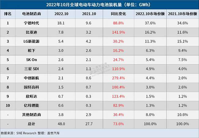 12月2日,韩国市场研究机构SNE Research公布的数据显示,2022年10月,全球电动汽车电池装机量达到48 GWh,同比增长73.6%,连续28个月保持稳定增长。在2021年创下“五连冠”的记录后,宁德时代自年初以来已连续10个月在榜单中强势领跑。比亚迪也不甘落后,一直与LG新能源角逐第二名,装机量再创月度新高,并在榜单中再度夺得亚军。
