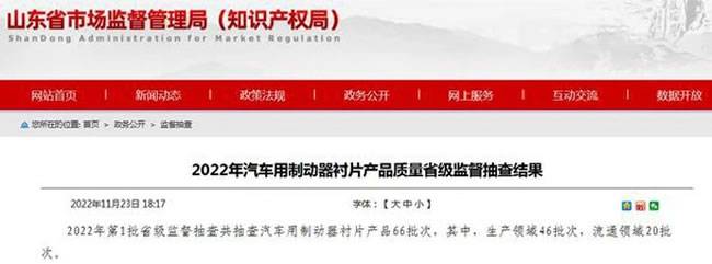 6、山东省市场监管局抽查汽车用制动器衬片产品,2批次不合格