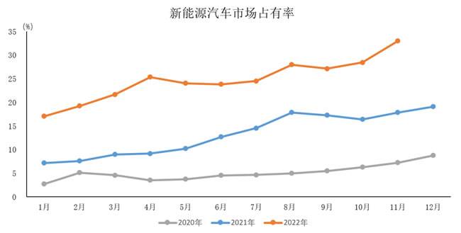 2022年11月,新能源汽车产销分别完成76.8万辆和78.6万辆,同比分别增长65.6%和72.3%,市场占有率达到33.8%。