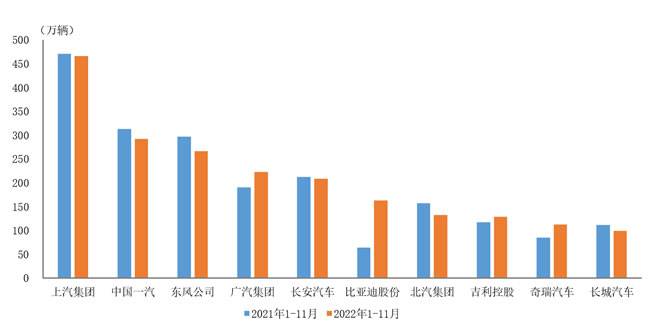 据中国汽车工业协会统计分析,2022年1-11月,汽车销量排名前十位的企业(集团)共销售2094.5万辆,占汽车销售总量的86.2%。 在上述十家企业中,与上年同期相比,比亚迪股份销量增速最为明显,奇瑞汽车、广汽集团和吉利控股也呈两位数快速增长,其他企业呈不同程度下降。