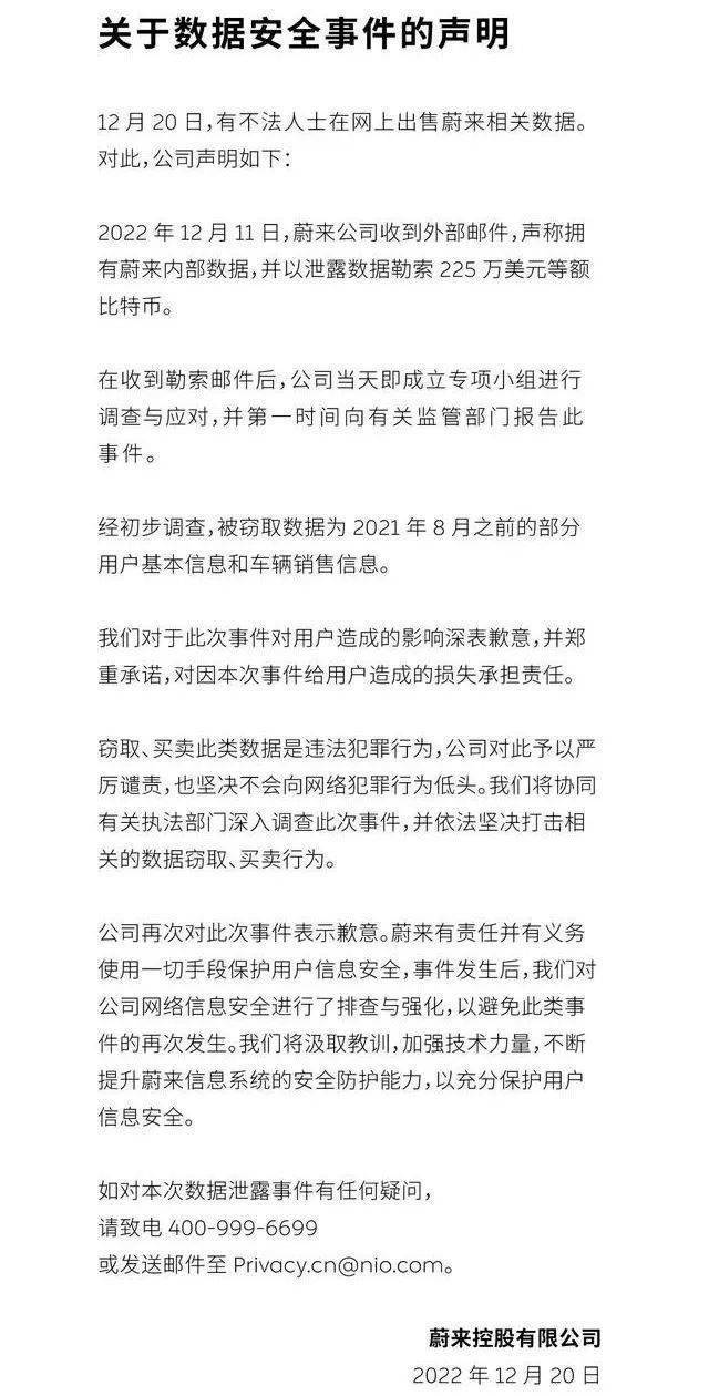 12月20日,根据蔚来汽车发布的一份声明显示,12月11日,蔚来公司收到外部邮件,声称拥有蔚来内部数据,并以泄露数据勒索225万美元等额比特币(约合1570.5万元人民币)。在收到勒索邮件后,公司当天即成立专项小组进行调查与应对,并第一时间向有关监管部门报告此事件。经初步调查,被窃取数据为2021年8月之前的部分用户基本信息和车辆销售信息。