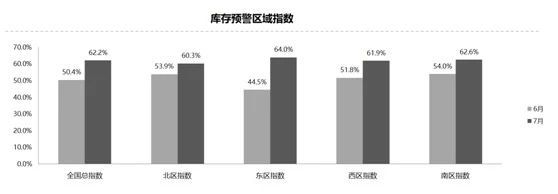 从区域指数情况看:7月份全国总指数为62.17%,北区指数为60.34%,东区指数为63.95%,南区指数为62.6%,西区指数为61.92%。