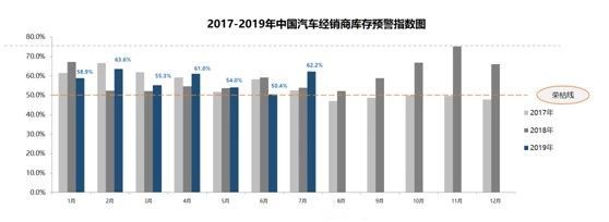 2019年7月31日,中国汽车流通协会发布的最新一期“中国汽车经销商库存预警指数调查”VIA(Vehicle Inventory Alert Index)显示,2019年7月汽车经销商库存预警指数为62.2%,环比上升11.8百分点,同比上升8.3个百分点,库存预警指数位于警戒线之上。