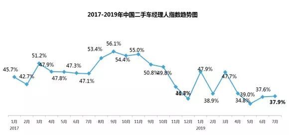 2019年8月2日,中国汽车流通协会发布2019年7月份“中国二手车经理人指数”(UCMI)。本期UCMI结果显示,7月份二手车经理人指数为37.9%,比6月份上升0.3个百分点,仍处于荣枯线之下,二手车市场不活跃。