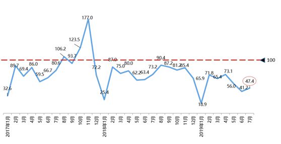 2019年8月2日,中国汽车流通协会发布最新一期“汽车消费指数”:2019年7月汽车消费指数为47.4,预计8月份销量较7月份有所上升,但受到国五国六切换的影响,市场表现仍然一般。