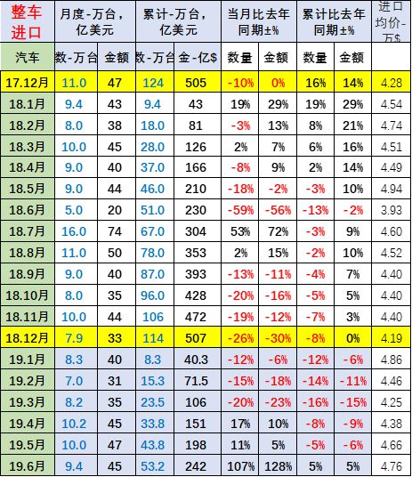 1-6月,中国汽车进口53万台增5%,其中6月进口9.4万台,进口量同比增107%,环比5月的10万台稍有下降。