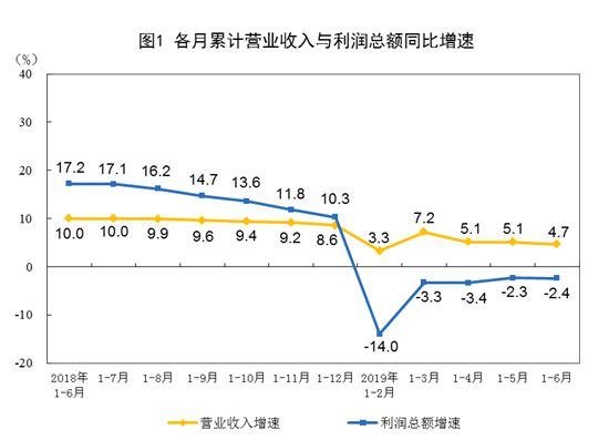 2019年1-6月,全国规模以上工业企业实现利润总额29840.0亿元,同比下降2.4%,降幅比1—5月份扩大0.1个百分点。在41个工业大类行业中,26个行业利润总额同比增加,15个行业减少。主要行业利润情况如下:石油和天然气开采业利润总额同比增长17.8%,专用设备制造业增长16.6%,电气机械和器材制造业增长13.0%,非金属矿物制品业增长11.9%,电力、热力生产和供应业增长11.5%,通用设备制造业增长5.5%,有色金属冶炼和压延加工业增长3.1%,石油、煤炭及其他燃料加工业下降53.6%,汽车制造业下降24.9%,黑色金属冶炼和压延加工业下降21.8%,化学原料和化学制品制造业下降13.8%,计算机、通信和其他电子设备制造业下降7.9%,煤炭开采和洗选业下降7.1%,农副食品加工业下降2.0%,纺织业下降0.1%。(数据来源:统计微讯)