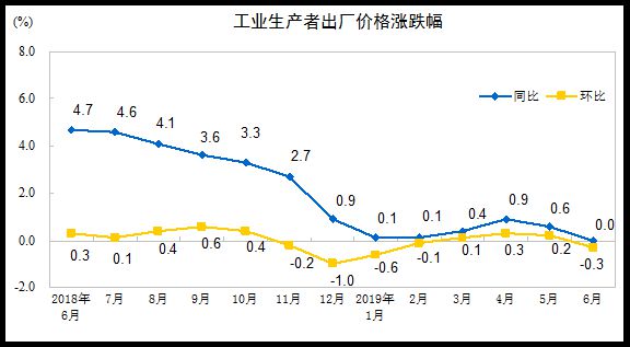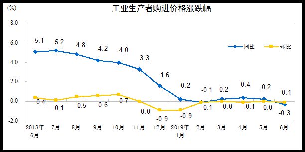 2019年1-6月,工业生产者出厂价格比去年同期上涨0.3%,工业生产者购进价格上涨0.1%。工业生产者出厂价格中,生产资料价格环比下降0.4%,影响工业生产者出厂价格总水平下降约0.31个百分点。其中,采掘工业价格下降0.1%,原材料工业价格下降1.0%,加工工业价格下降0.2%。生活资料价格环比持平。其中,食品、衣着和耐用消费品价格均持平,一般日用品价格上涨0.1%。工业生产者购进价格中,黑色金属材料类价格环比上涨0.7%,农副产品类价格上涨0.5%;化工原料类价格下降1.2%,有色金属材料及电线类价格下降0.5%,燃料动力类价格下降0.4%。(数据来源:统计微讯)