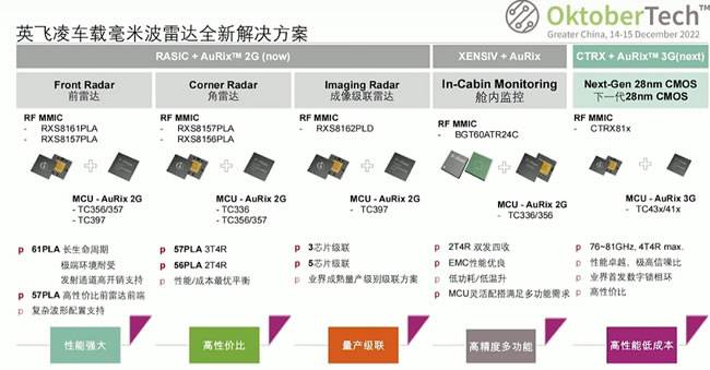 在角雷达方面,针对成本比较敏感的客户,英飞凌有2发4收的RXS8156PLA,搭配相对经济的TC336和TC356系列,或者TC357系列的AURIX™MCU,可以给用户提供具有性价比的角雷达方案。