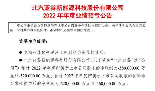 1月30日,北汽蓝谷发布2022年年度业绩预亏公告。公告称,报告期内,公司预计亏损52亿至58亿元,与2021年亏损基本持平。公司预计归属于上市公司股东的扣非净亏损为56亿元到62亿元。