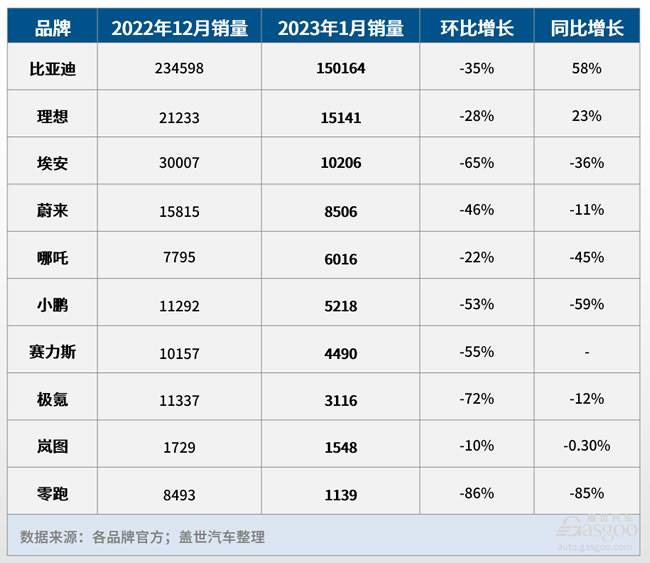 从各品牌披露的数据看的确如此,当天共有10余个品牌公布销量,无论是环比还是同比,这些品牌月销大部分都呈下降态势。事实上,今年1月新能源品牌销量下滑不难预料,一方面,1月包含春节假期,期间部分交付工作或会延迟,另一方面,进入2023年,新能源汽车国补已经取消,原本打算年初购车的订单早已在2022年年末被提早释放,而新订单增长开始乏力。
