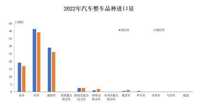 2022年,整车进口量同比下降6.5%;整车进口金额同比微降。