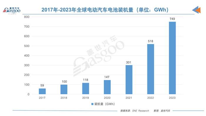 近几年来,全球电动汽车和电池市场蓬勃发展。全球电动汽车销量已从2018年的200万辆上涨至2022年的1,000多万辆,市场份额也从2.5%涨至14%。电动汽车浪潮席卷全球也推动了动力电池市场的发展,全球电动汽车电池装机量从2017年的59 GWh大幅增长至2022年的518 GWh,年复合增长率高达54%。