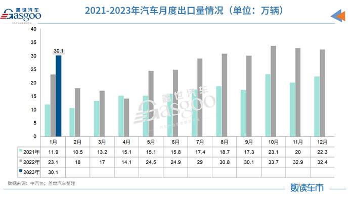 在1月整体汽车市场中,汽车出口是唯一一个延续良好表现的板块。数据显示,1月,我国汽车企业出口30.1万辆,环比下降7.1%,同比增长30.1%,已然成为整体车市的重要增长极。