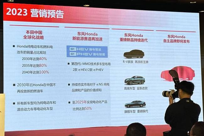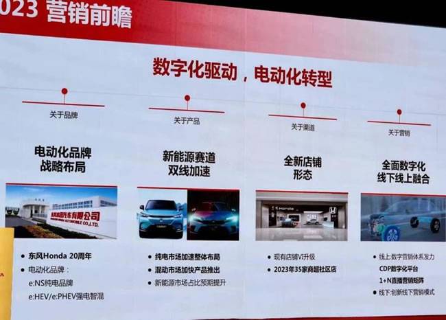 东风本田在2023年将坚持数字化驱动和电动化转型。在品牌方面,东风本田将坚持电动化品牌战略布局,包括举办东风本田20周年活动,以及持续打造电动化品牌:e:NS纯电品牌、e:HEV/e:PHEV强电智混。在产品方面,东风本田坚持新能源赛道双线加速,包括纯电市场加速整体布局,混动市场加快产品推出,新能源市场占比预期提升。在渠道方面,东风本田将打造全新店铺形态,包括现有店铺VI升级,并在2023年建设35家商超社区店。在营销方面,东风本田致力于实现全面数字化,线下线上融合。线上数字营销体系发力,打造CDP数字化平台和1+N直播营销矩阵;线下则将打造创新线下营销模式。