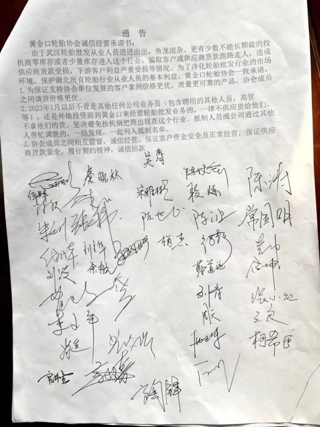 近日,武汉市黄金口轮胎协会发出一封多位老板联合签字的经营承诺书,并附黄金口轮胎协会优质企业名单。