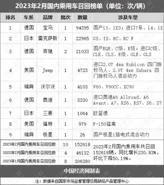据国家市场监督管理总局缺陷产品管理中心数据,2月,国内共有9家品牌累计发布10起公告,共召回乘用车152618辆,同比增长230.83%,环比下降50.19%,依旧延续低位运行。